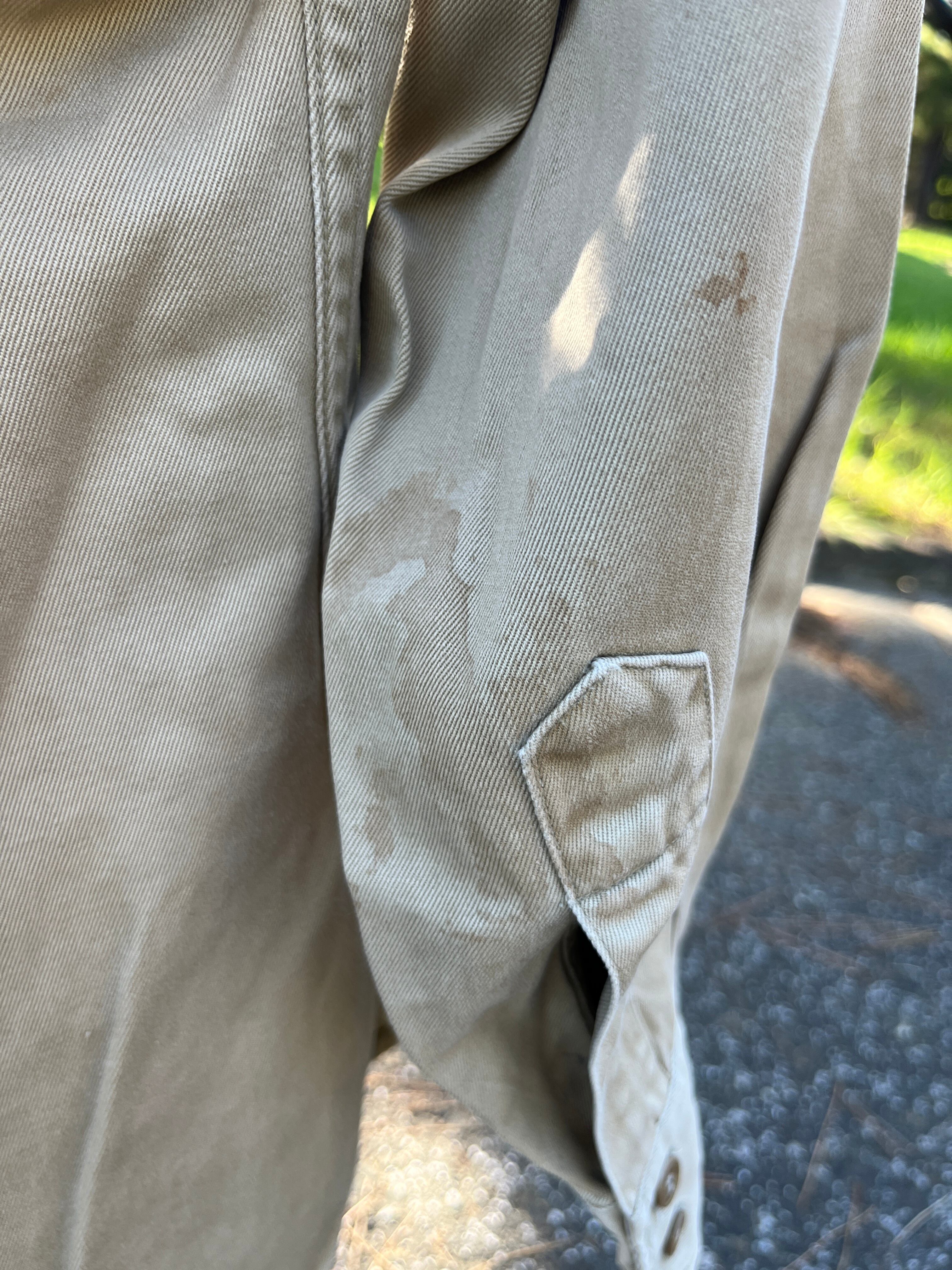 右腕、右胸ポケットの汚れ、フロント第4ボタン欠損